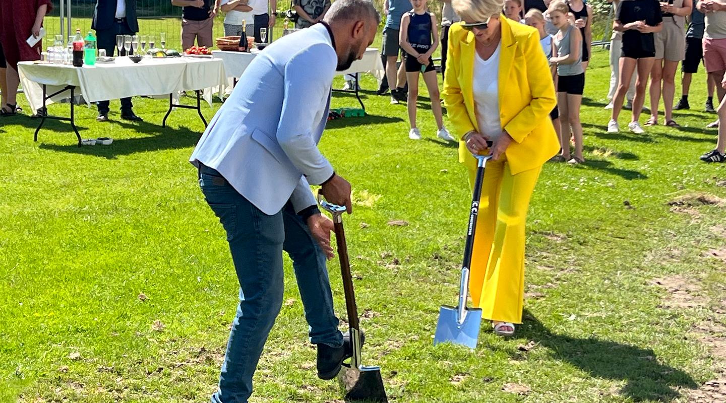 Fru Salling og Rådmand for Kultur ved Aarhus Kommune, Rabih Azad-Ahmad (RV), tog sammen 1. spadestik til det nye springcenter.