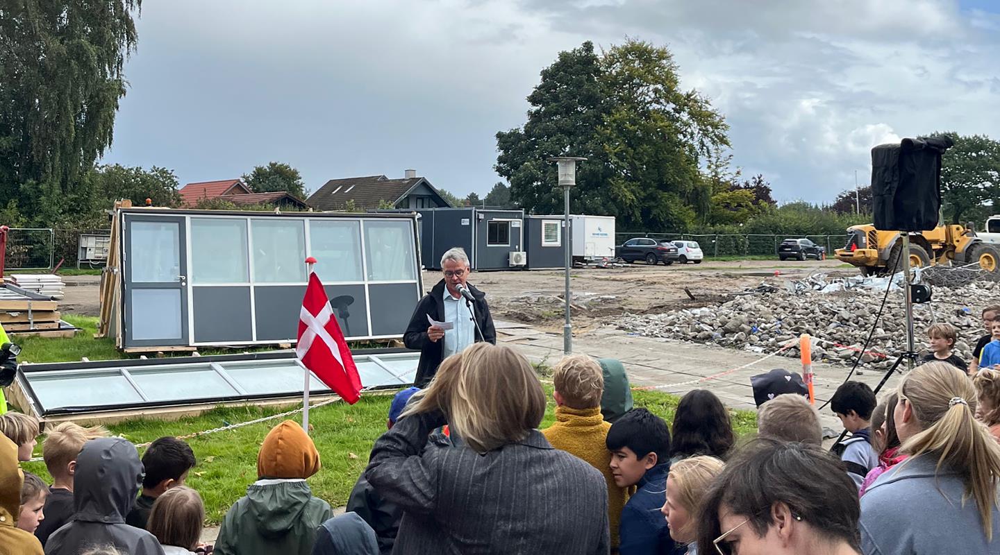 Det blev bl.a. markeret med taler af skoleleder Lone Krog, borgmester Dorthe West og c.c. contractors direktør Jørn From, som skal stå for opførelsen.
