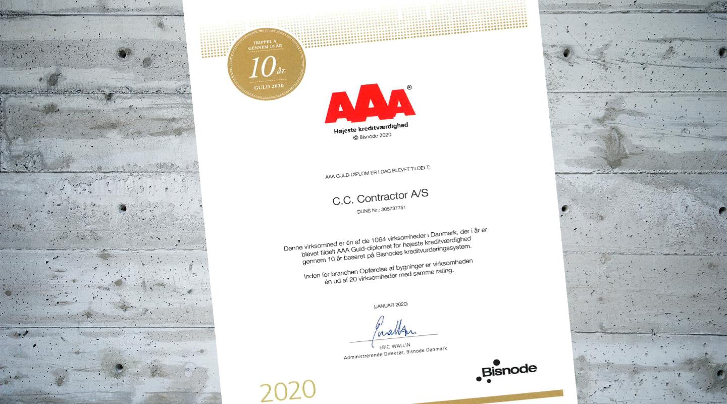 c.c. contractor er én af de 1064 virksomheder i Danmark, der i år er blevet tildelt AAA Guld-diplomet for højeste kreditværdighed genmem 10 år baseret på Bisnodes kreditvurderingsystem.